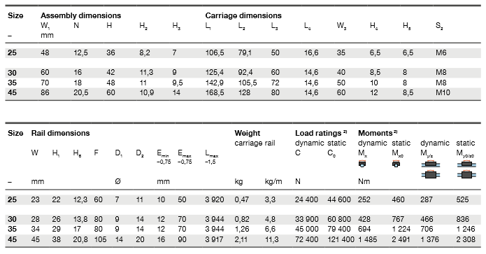 标准高度的细长滑块可供20到45的尺寸。配有4个螺纹,可从顶部安装。额定载荷和刚度增加。
